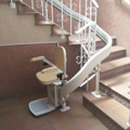 Esta silla supera un piso de desnivel transportando al usuario desde el patio principal de la entrada del chalet a la casa. Se ha realizado un aparcamiento 90º grados en la planta inferior, dejando libre el ancho de escalera.