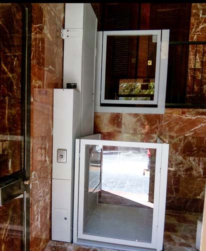 Plataforma vertical Izaro ubicada en el zaguán de una comunidad de vecinos en Velilla de San Antonio una población que pertenece a la Comunidad de Madrid.